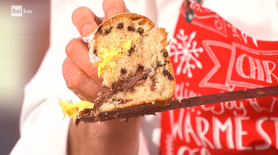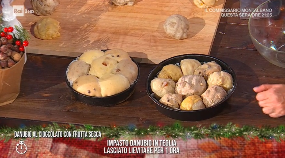 Dividiamo l’impasto ottenuto in 4 parti uguali e ad ognuna aggiungiamo un ingrediente: gocce di cioccolato, canditi, noci sgusciate, pinoli. Mettiamo i 4 panetti in 4 ciotole distinte, li copriamo con la pellicola e lasciamo lievitare 1 ora e mezza a temperatura ambiente. Formiamo delle palline ben lisce da 80 g e le inseriamo, alternandole, all’interno di tortiere foderate con carta forno. Copriamo e lasciamo lievitare ancora 1 ora a temperatura ambiente. Spennelliamo con l’uovo sbattuto e cuociamo in forno caldo e statico a 170° per 40 minuti. Possiamo gustarlo ‘staccando’ una pallina, oppure possiamo tagliarlo in tre dischi, come fosse una torta, e farcire ogni strato con crema spalmabile alla nocciola e della crema chantilly. Serviamo a fette, proprio come una torta.