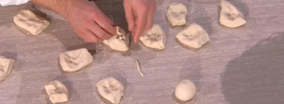 Dividiamo l’impasto in circa 20 palline. Stendiamo ciascuna pallina con le mani o il mattarello. Su ogni dischetto mettiamo un cucchiaio di ripieno (mozzarella e mortadella). Ripieghiamo l’impasto sul ripieno ed arrotondiamo ogni pallina, roteandola sul piano da lavoro.
