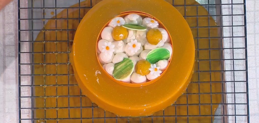 Panna cotta: in una ciotola, mescoliamo la panna calda con il cioccolato biondo fuso. Uniamo il glucosio e la gelatina sciolta. Versiamo il composto all’interno di uno stampo del diametro inferiore alla torta finale e congeliamo.