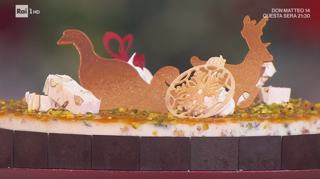 - Crema: 225 ml miele, 50 ml acqua, 75 g albumi, 500 ml panna, 100 g nocciole, 150 g mandorle, 150 g pistacchi, 15 g gelatina, vaniglia, scorza di limone