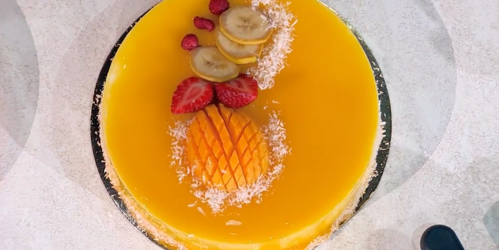 Glassa: mettiamo in una pentola la polpa di mango, lo zucchero, il glucosio, la gelatina sciolta in acqua, la gelatina neutra, il burro di cacao e portiamo a bollore. Spegniamo e lasciamo intiepidire.