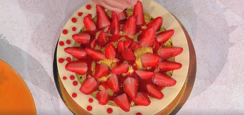 Decoriamo la torta ormai fredda con la crema al limone: ne copriamo la superficie. Finiamo con salsa di fragole e fragole fresche.