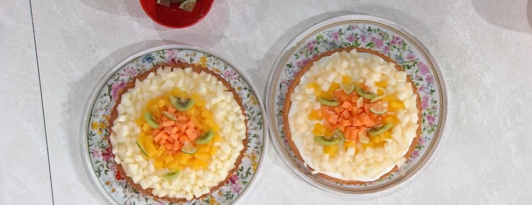 Per la crema, montiamo la panna con lo zucchero a velo, fino a renderla bella soda. Aggiungiamo lo yogurt greco ben sgocciolato e mescoliamo ancora qualche istante. Possiamo aggiungere anche la gelatina reidratata in acqua, scolata e sciolta in poco latte. Spalmiamo la crema sulla confettura di mango e mettiamo in frigorifero per almeno mezz’ora. Decoriamo la superficie con la frutta fresca.