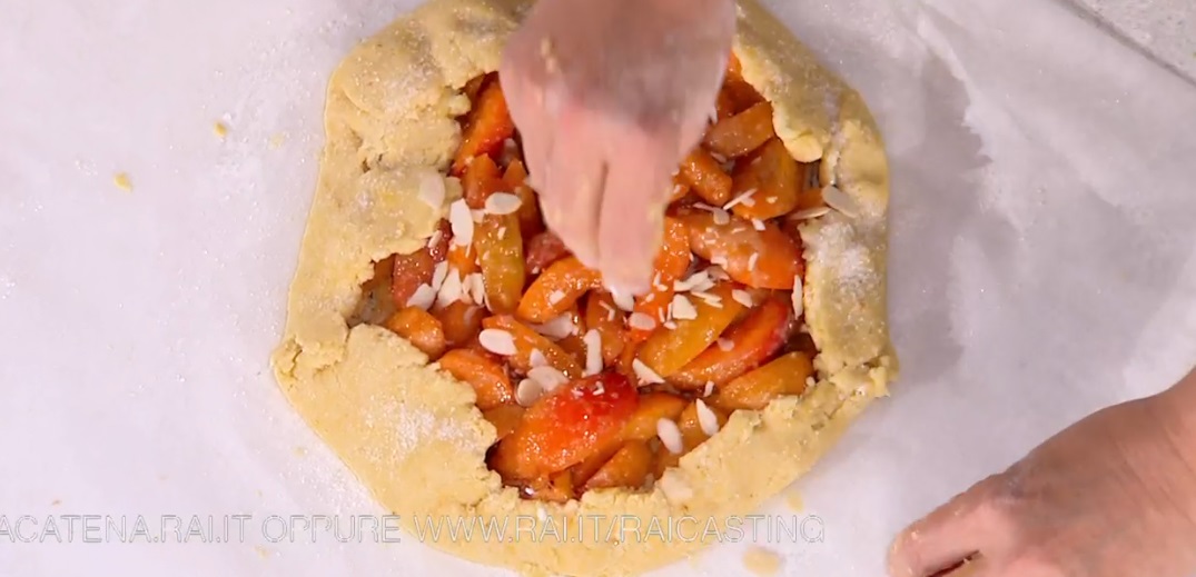 Spalmiamo sulla base di frolla la confettura di albicocche, sbricioliamo sopra i biscotti (quelli un po’ burrosi e non troppo secchi). Infine distribuiamo sopra gli spicchi di albicocche macerate con il sughetto rimasto. Ripieghiamo i bordi dell’impasto sul ripieno, spolveriamo di zucchero semolato e mandorle a lamelle. Mettiamo su una teglia foderata con carta forno e inforniamo a 180° per 40 minuti.