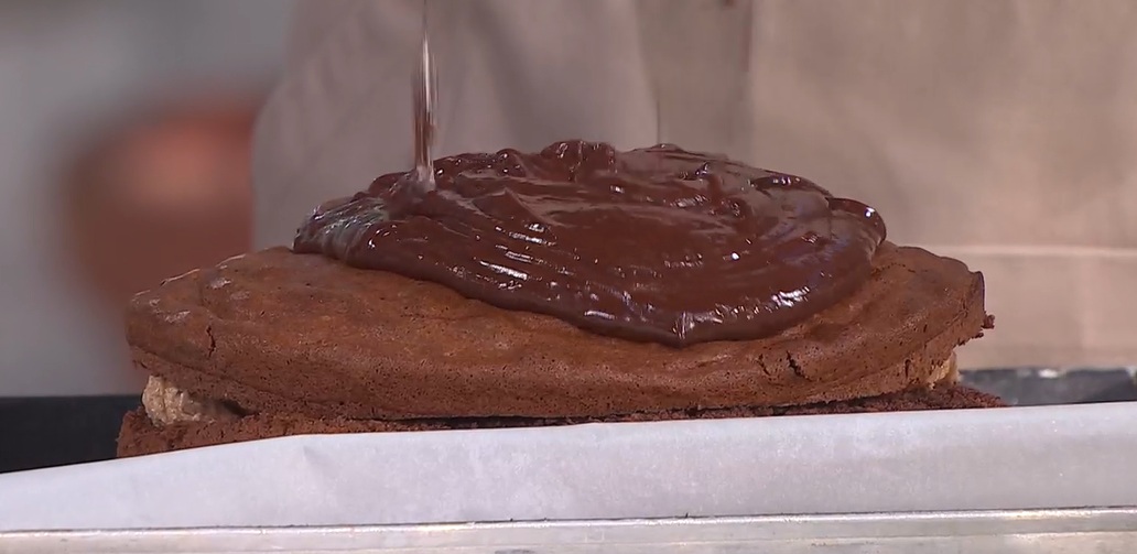 Prepariamo la ganasce mescolando la panna e il  cioccolato fuso. Coliamo la ganasce sulla torta.