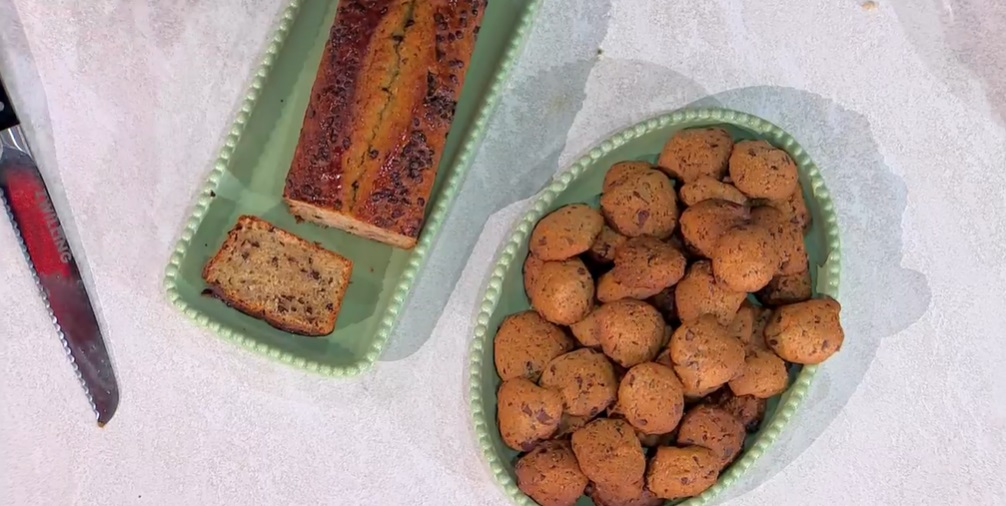 - Banana bread: 200 g farina 00, 100 g zucchero di canna, 4 banane, 60 g gocce di cioccolato, 2 uova, 60 ml olio di semi, 3 cucchiaini di lievito per dolci, vaniglia