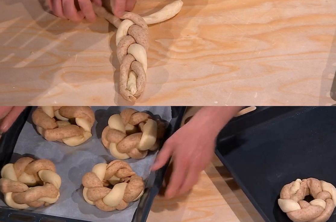 Allunghiamo ancora i filoncini, fino a raggiungere una lunghezza di 40-50 cm. Prendiamo due filoncini integrali ed uno bianco, e viceversa, e li intrecciamo. Chiudiamo la treccia a ciambella, la posizioniamo sulla teglia e lasciamo lievitare, coperta, fino al raddoppio. Spennelliamo con l’uovo sbattuto e cuociamo in forno a 180° per 16 minuti. Serviamo con al centro un po’ di ovetti di cioccolato.