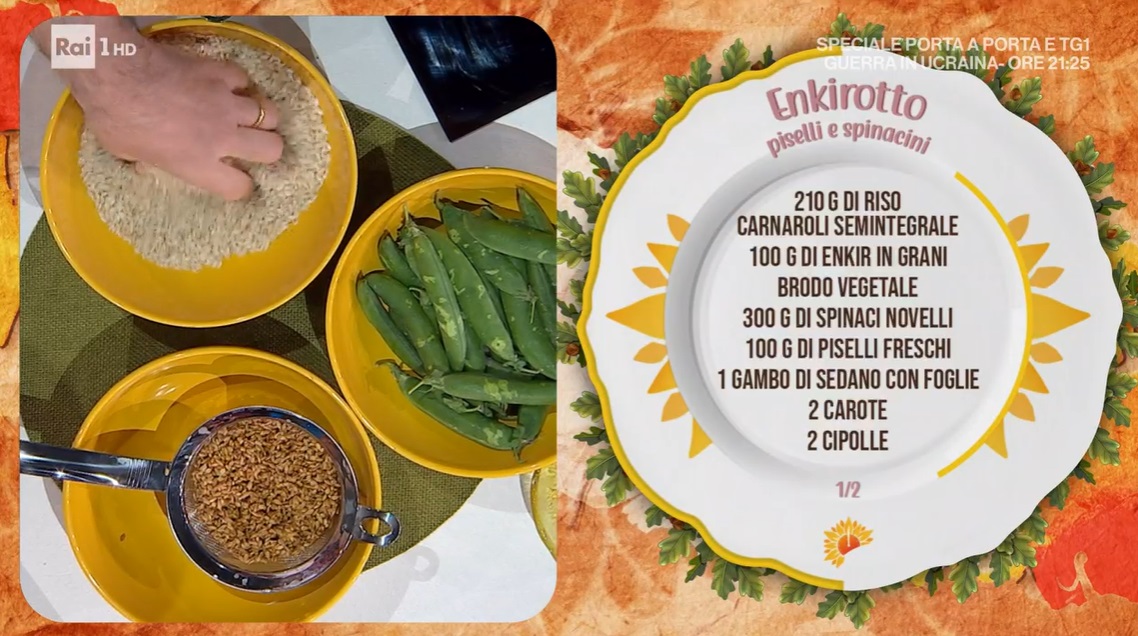 - 210 g riso carnaroli semintegrale, 100 g enkir in grani, brodo vegetale, 300 g spinaci novelli, 100 g piselli freschi, 1 gambo di sedano con foglie, 2 carote, 2 cipolle, 1 limone, 80 g formaggio grattugiato, 200 g ricotta vaccina, 200 ml birra di enkir, 50 g mandorle con la pelle, alloro, olio evo, sale e pepe