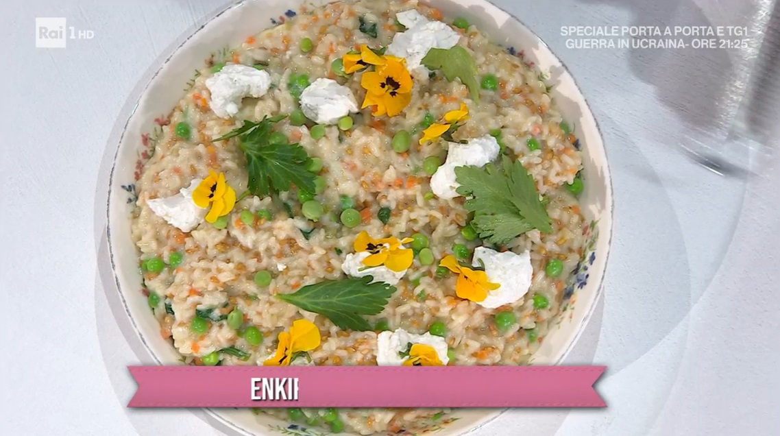 Verso fine cottura aggiungiamo i piselli, che prima lessiamo a parte, e gli spinacini novelli freschi e tagliati grossolanamente. Infine mantechiamo con il formaggio grattugiato e parte della ricotta lavorata con il pepe. Serviamo decorando con fiori eduli, quenelle di ricotta, qualche foglia di sedano e della scorza grattugiata di limone.