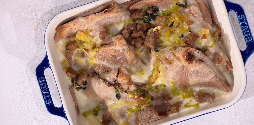 Al centro di ogni crepe, mettiamo un cucchiaio di gorgonzola, un po’ di salsiccia, un po’ di verza, un po’ di besciamella e ripieghiamo la crepe sul ripieno, a fazzoletto, formando un fagottino.