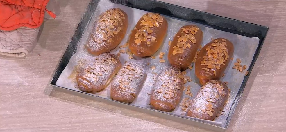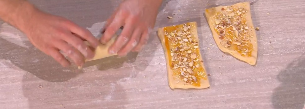Su ognuno, spalmiamo un velo di confettura di albicocche (o burro) e distribuiamo sopra le mandorle tostate e tritate grossolanamente. Arrotoliamo ogni rettangolino su se stesso, partendo dal lato corto, in modo da formare una chiocciola. Disponiamo quest’ultime su una teglia con carta forno, le copriamo e le lasciamo riposare fino al raddoppio.