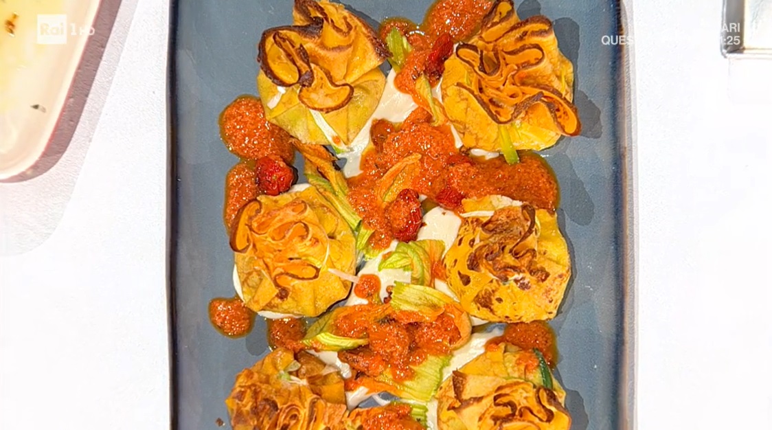 La cucina di tinge di giallo-rosso, con Gian Piero Fava. Il cuoco romano, ‘sbocciato’ tra i fornelli di Rai1, prepara un piatto con dei fiori di zucca, che a breve coloreranno i nostri orti. Ecco i fagottini di crepes.