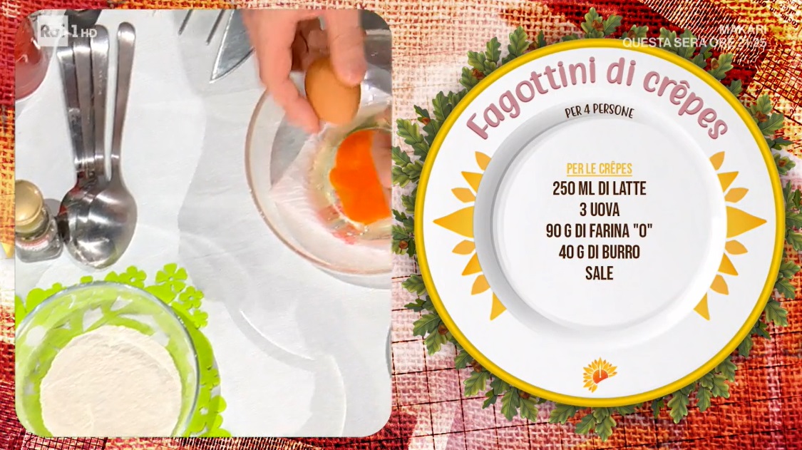 - Crepes: 250 ml latte, 3 uova, 90 g farina 0, 40 g burro, sale