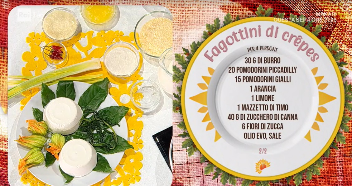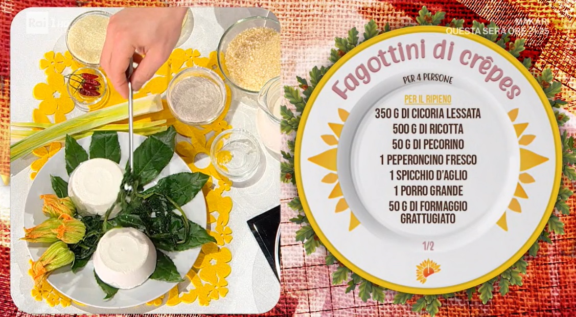 - 350 g cicoria lessata, 500 g ricotta, 50 g pecorino, 1 peperoncino, 1 spicchio d’aglio, 1 porro grande, 50 g formaggio grattugiato, 30 g burro, 20 pomodorini, 15 pomodorini gialli, 1 arancia, 1 limone, timo, 40 g zucchero di canna, 6 fiori di zucca, olio evo, sale