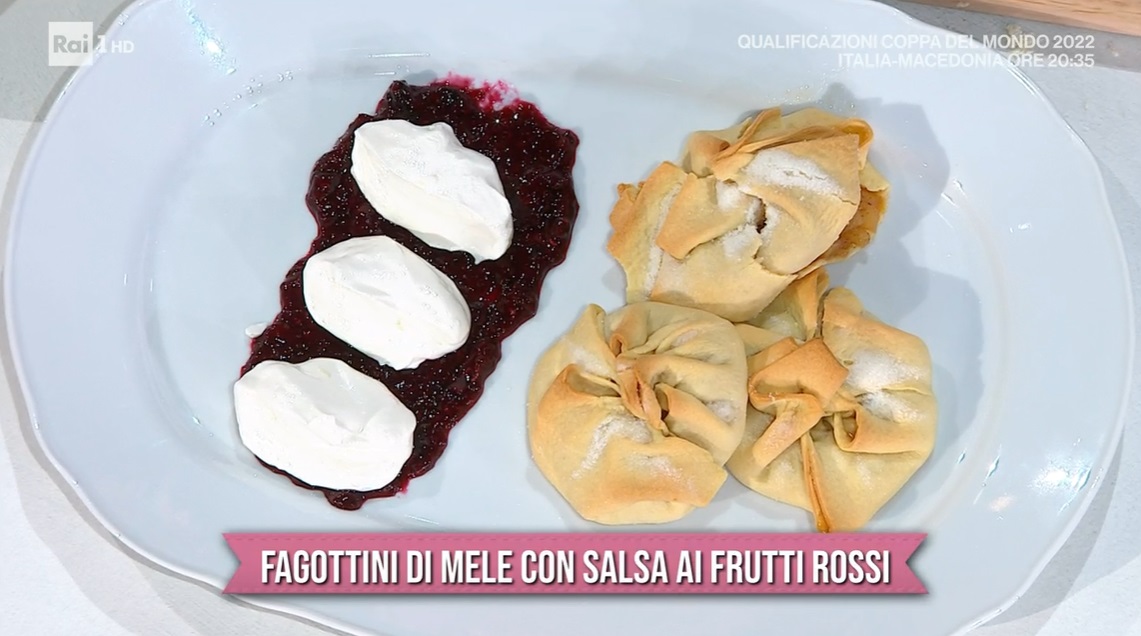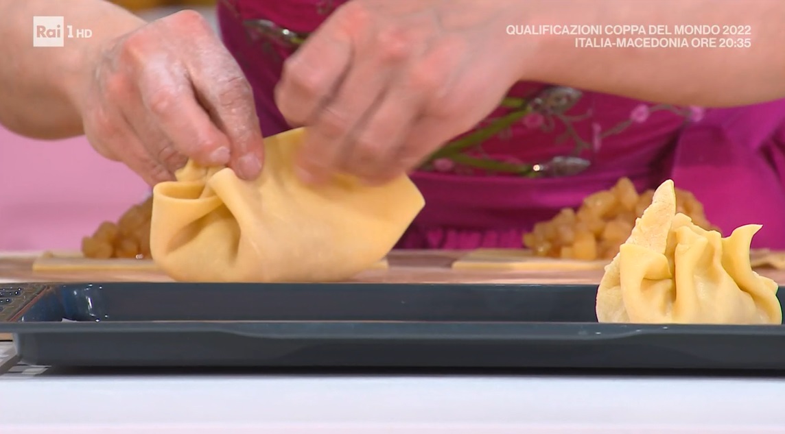 Tiriamo la sfoglia sottile e ritagliamo un rettangolo grande, da cui ricaviamo 4 quadratoni 15×15 cm. Su ogni quadratone, spalmiamo un po’ di confettura di albicocche, un po’ delle mele spadellate e richiudiamo la sfoglia sul ripieno, arricciando la stessa sopra (foto). Spolveriamo con zucchero semolato e cuociamo in forno statico e caldo a 180° per 20 minuti.