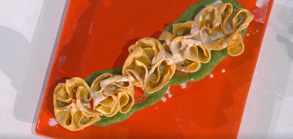 Tiriamo la pasta all’uovo, sottile, e ne ritagliamo dei rettangoli, come delle lasagne. Li sbollentiamo.