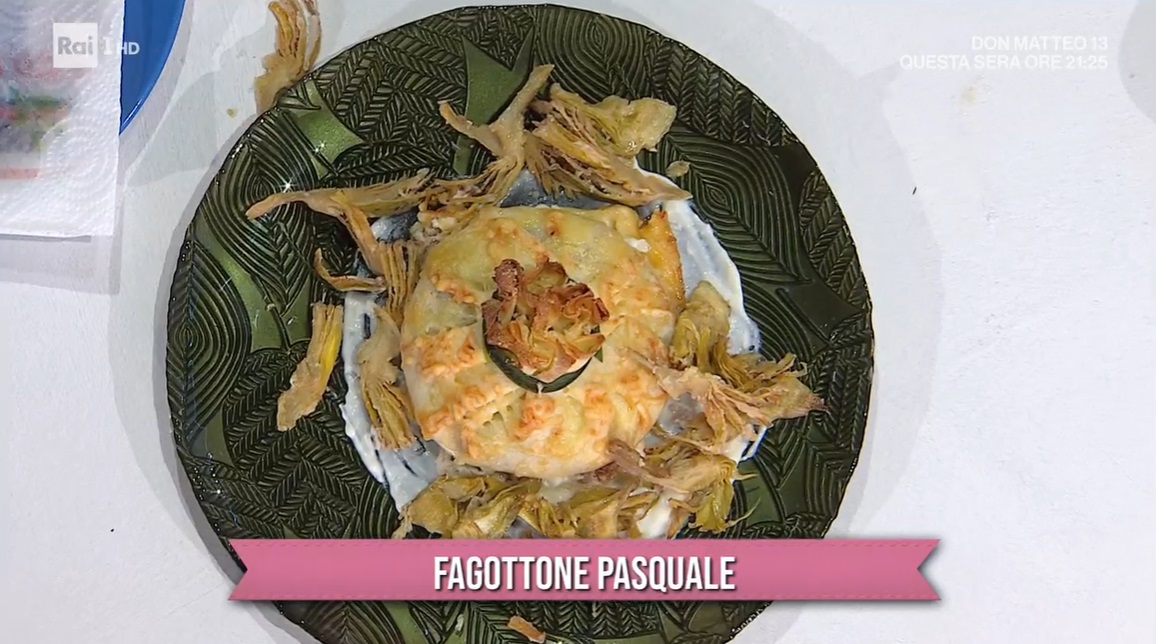 Farciamo le crespelle con il ripieno di ricotta e le chiudiamo con delle striscioline di porro. Sporchiamo la base di una pirofila con la besciamella, disponiamo sopra i fagottini e li finiamo con una spolverata di formaggi grattugiati. Passiamo in forno caldo a 180° per 10 minuti: deve dorare. Serviamo con altra besciamella ed i carciofi fritti.