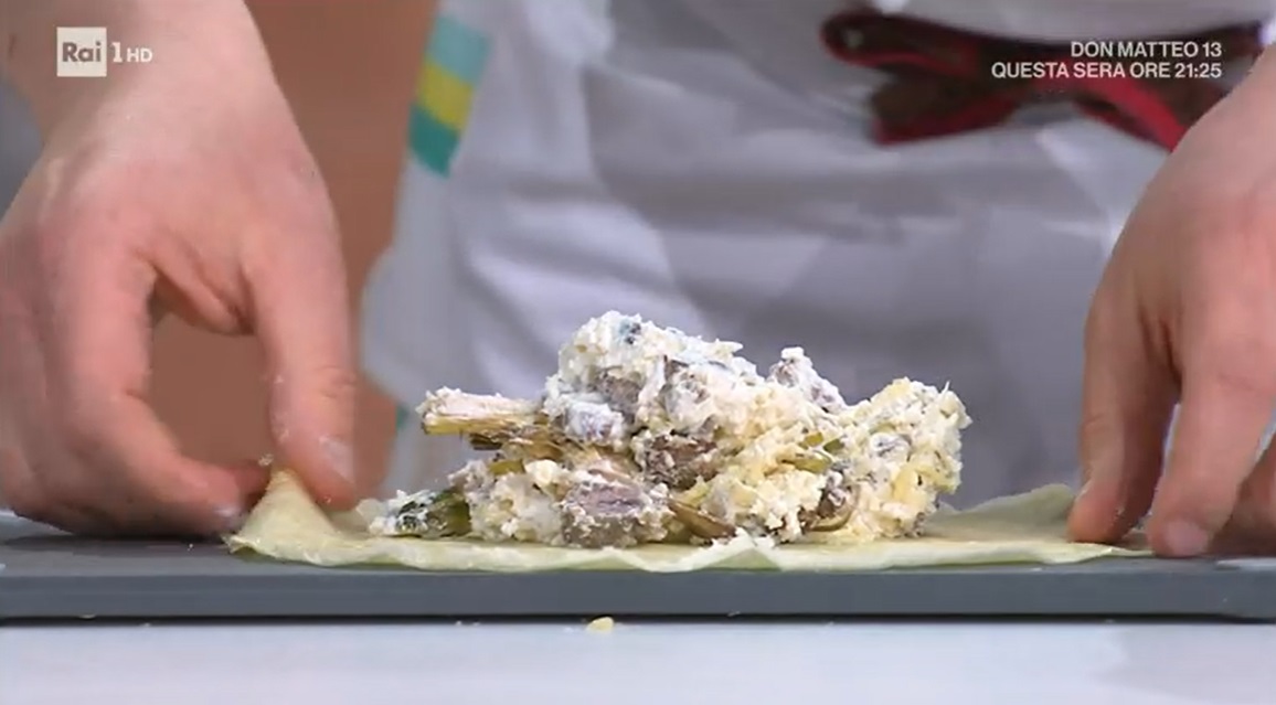 Per il ripieno, in una ciotola, mettiamo la ricotta, metà del groviera grattugiato, metà del pecorino grattugiato, i carciofi stufati e l’agnello cotto e a dadini. Mescoliamo il tutto.
