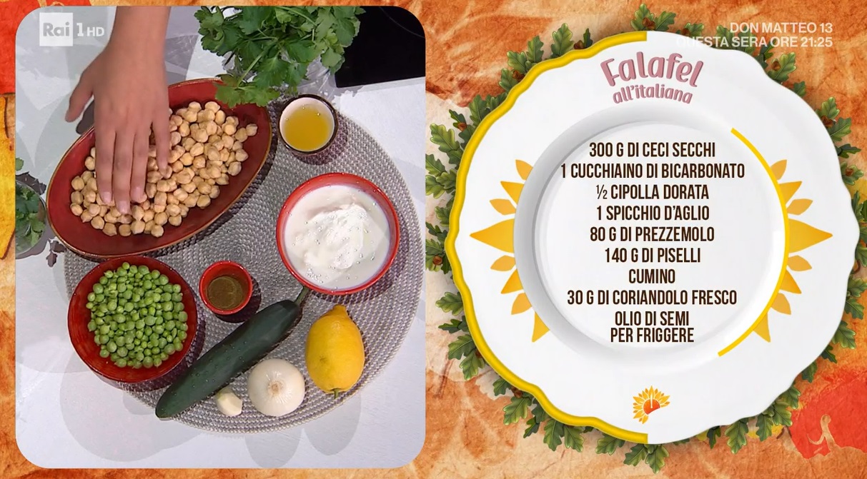 - 300 g ceci secchi, 1 cucchiaino di bicarbonato, mezza cipolla dorata, 1 spicchio d’aglio, 80 g prezzemolo, 140 g piselli, cumino, 30 g coriandolo fresco, olio per friggere