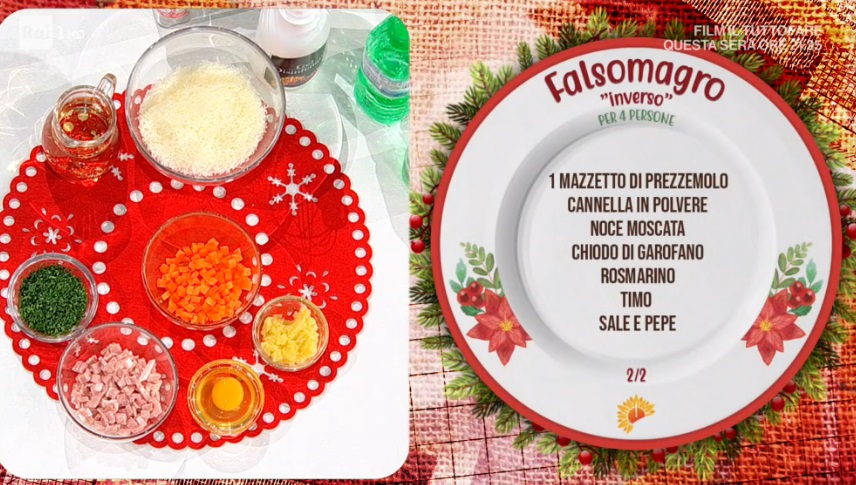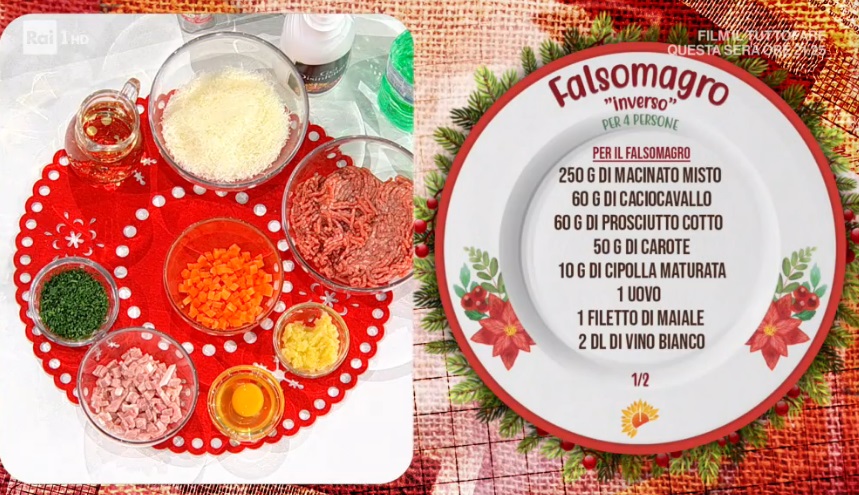 - 250 g macinato misto vitello e maiale, 60 g caciocavallo, 60 g prosciutto cotto, 50 g carote, 10 g cipolla maturata, 1 uovo, 1 filetto di maiale, 2 dl vino bianco, 1 mazzetto di prezzemolo, cannella in polvere, noce moscata, chiodi di garofano, rosmarino, timo, sale e pepe