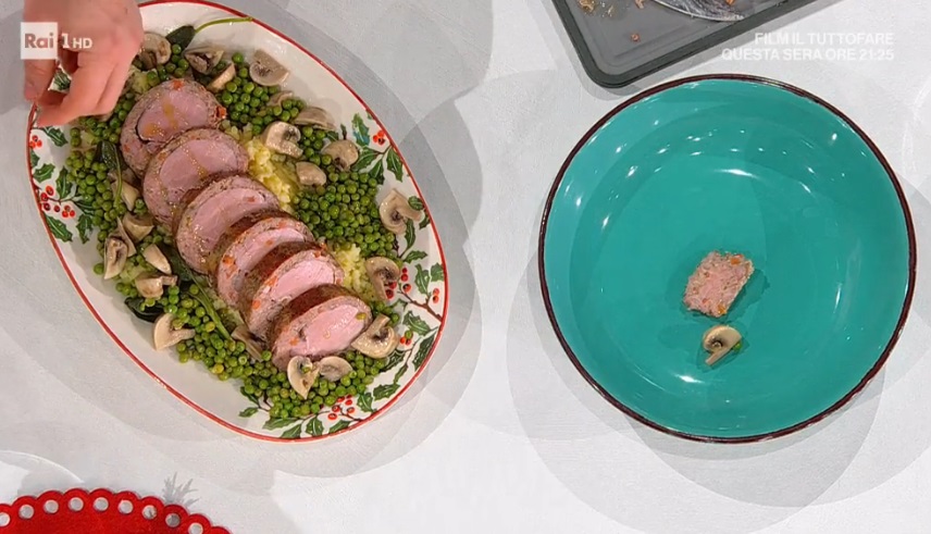Poi lo rosoliamo in una padella con olio ed erbe aromatiche, infine lo tagliamo a fette e lo serviamo con i contorni: funghi e piselli rosolati con olio, aglio e della salvia, sfumati col vino e poi cotti con un goccio di acqua; oppure, patate lessate, tagliate e condite con olio, sale, pepe e timo.