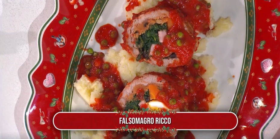 - 1 fetta di fesa di vitello, 200 g pangrattato, 20 g uvetta, 20 g pinoli, 60 g salsa di pomodoro cotta, 70 g caciocavallo, 2 carote, 200 g prosciutto cotto, 200 g caciocavallo, 4 uova sode, 200 g spinaci lessati, 1 spicchio d’aglio, mezzo cucchiaino zucchero, prezzemolo, olio, sale e pepe