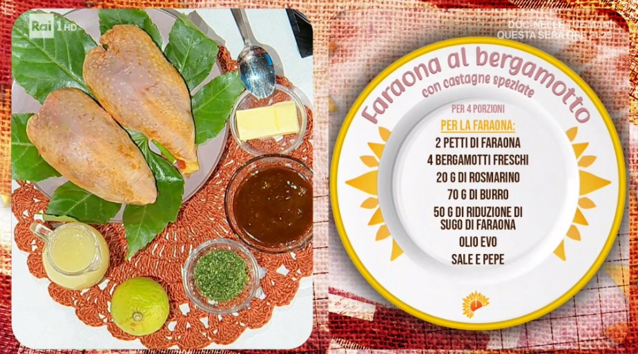 - 2 petti di faraona, 4 bergamotti (o 2 limoni o 2 lime), 20 g rosmarino, 70 g burro, 50 g riduzione di sugo di faraona, olio evo, sale e pepe