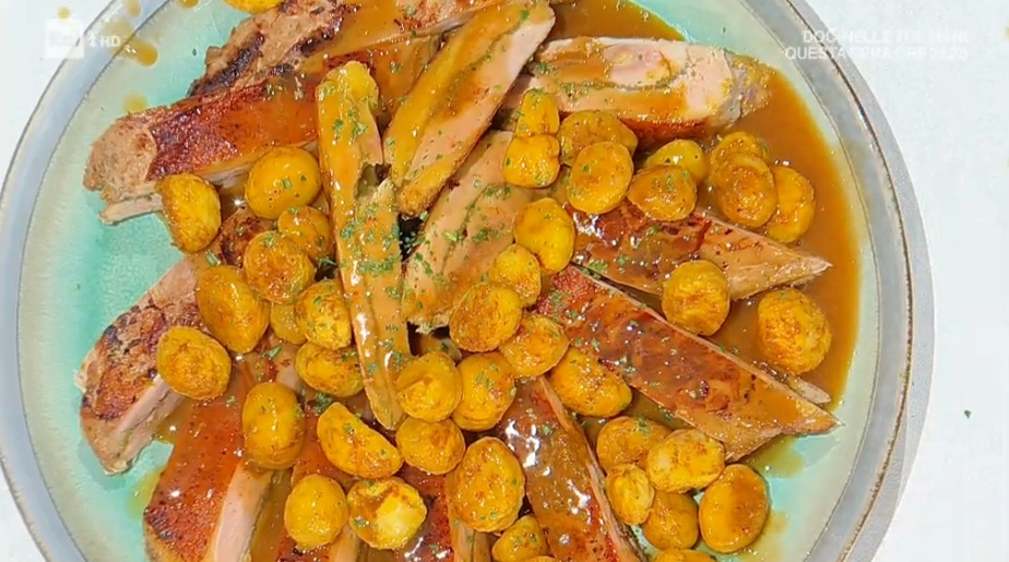Affettiamo il petto di fararona e lo serviamo con le castagne, quindi coliamo sopra il fondo di cottura.
