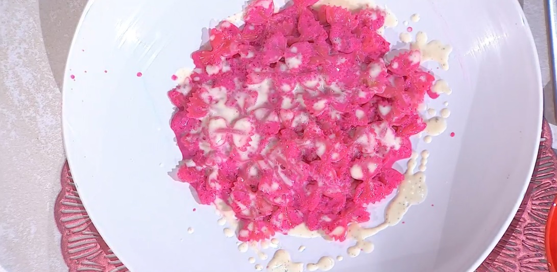 - 500 g farfalle, 2 rape rosse, 1 cipolla, 50 g burro, 30 g succo di limone, 250 ml panna, 100 g formaggio grattugiato, sale e pepe