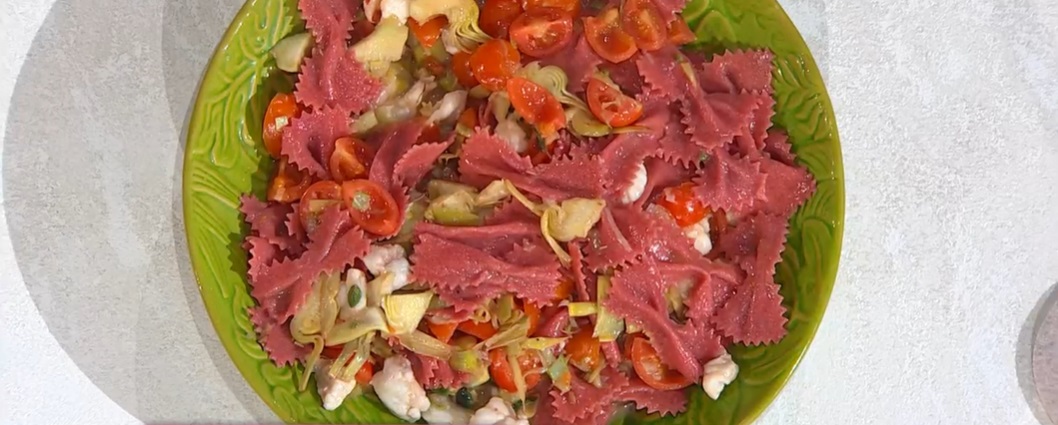Salsa: in padella, facciamo rosolare il cipollotto tritato con un filo d’olio. Uniamo i pomodorini a spicchi e lasciamo rosolare. Uniamo la rana pescatrice a cubotti e portiamo a cottura. Uniamo i carciofi spadellati, bagniamo con il fumetto e lasciamo insaporire qualche minuto. Scoliamo la pasta e la saltiamo con il condimento.