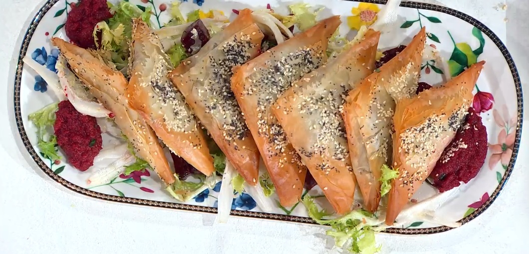 Ungiamo con olio un foglio di pasta fillo e ne sovrapponiamo un secondo. Ricaviamo dei rettangoli di circa 30-40 cm di lunghezza, 10 cm di larghezza. Mettiamo un bel cucchiaio di ripieno su un lato corto, quindi ripieghiamo la pasta sul ripieno, formando dei triangoli. Li posizioniamo su una teglia, spennelliamo con l’olio e spolveriamo con semi di sesamo e papavero. Passiamo in forno caldo a 200° per 10 minuti. Possiamo anche friggerli.