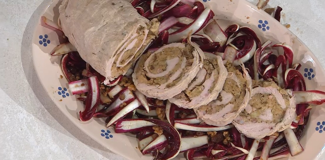 Prepariamo il contorno: laviamo, asciughiamo ed affettiamo il radicchio, quindi lo condiamo con le noci sbriciolate, l’uvetta già ammollata nell’acqua e scolata, olio, sale e aceto balsamico.