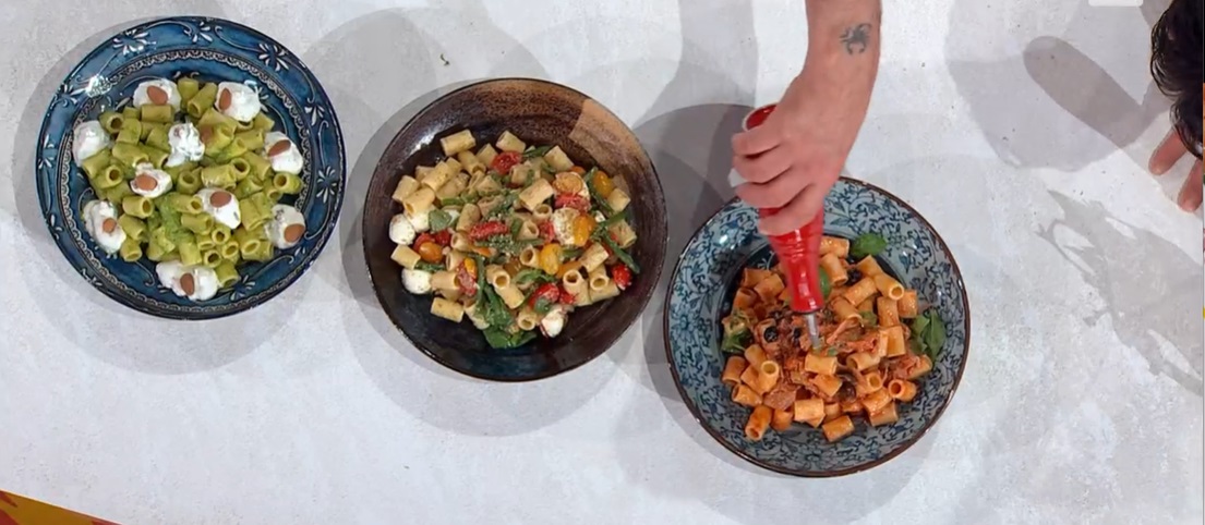 Per il terzo sugo, condiamo la pasta con capperi e olive scaldati in padella con un goccio di olio e del timo, uniamo poi nella ciotola anche il tonno scolato dall’olio, salsa di datterino a freddo, basilico e amalgamiamo.