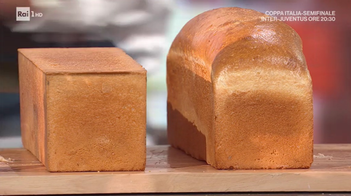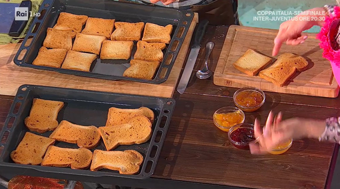 Sformiamo il pane in cassetta, lo lasciamo raffreddare e lo tagliamo a fette spesse circa un cm. Disponiamo le fette di pane sulla teglia e rimettiamo in forno caldo e statico a 170° fino a doratura: dev’essere ben secca.