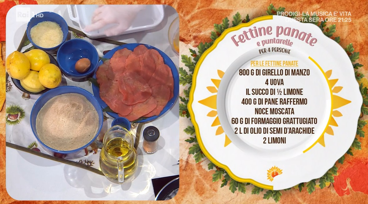 - 800 g girello di manzo, 4 uova, succo di mezzo limone, 400 g pane raffermo, noce moscata, 60 g formaggio grattugiato, 2 l olio di semi, 2 limoni