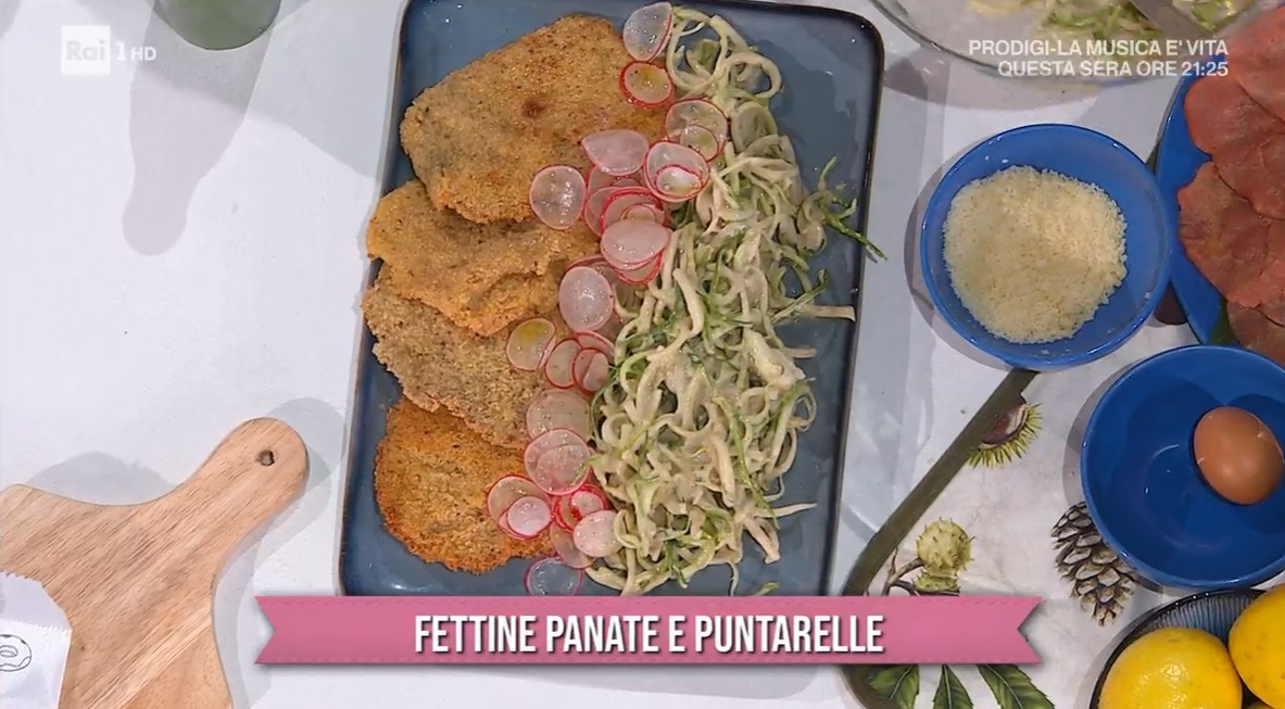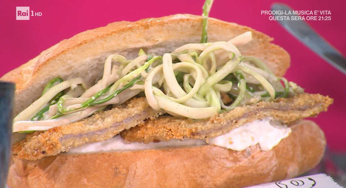 Con questi ingredienti, possiamo farcire un panino: tagliamo il pane a metà e lo farciamo con la burrata, la fettina fritta e le puntarelle condite.