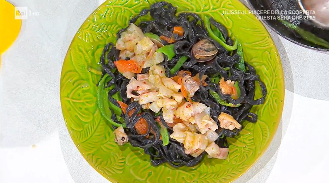 Prepariamo l’impasto: lavoriamo la farina 00 e la semola con le uova ed il nero di seppia. Ottenuto un impasto liscio ed omogeneo, lo avvolgiamo nella pellicola e lasciamo riposare per almeno mezz’ora. Stendiamo la sfoglia, ne ricaviamo le fettuccelle e le lessiamo in acqua bollente e salata.