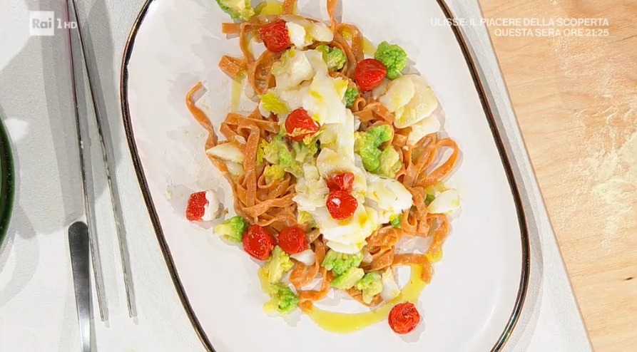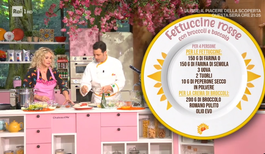 - Fettuccine: 150 g farina 0, 150 g farina di semola, 3 uova, 2 tuorli, 10 g peperone secco in polvere
