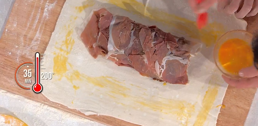 Trasferiamo il rotolo ottenuto sul rettangolo di sfoglia, spennelliamo i bordi con il tuorlo, quindi pieghiamo la sfoglia sul ripieno. Spennelliamo esternamente con il tuorlo, posizioniamo sulla teglia e cuociamo in forno caldo e ventilato a 200° per 35 minuti.