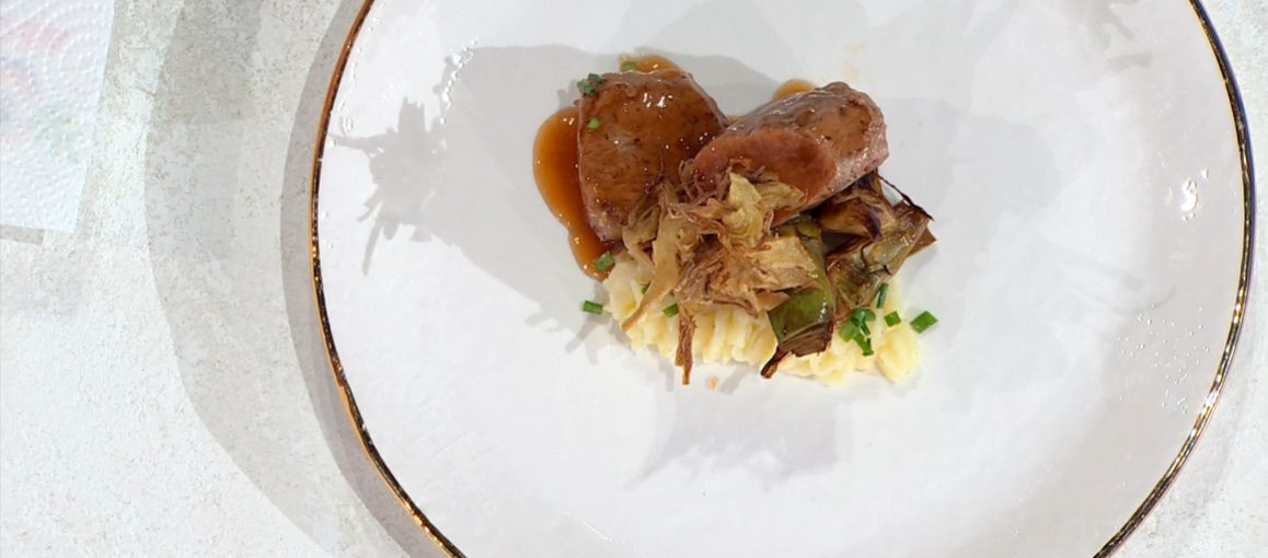 Serviamo il filetto a fette con sopra il fondo di carne ed un contorno di purè di patate e di carciofi, fritti e spadellati.