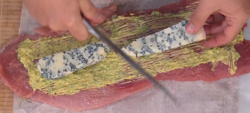 Sovrapponiamo leggermente due filetti di maiale, in modo da creare un rettangolo, e li spennelliamo con il composto di senape e aromi. Al centro, disponiamo il gorgonzola piccante. Arrotoliamo i filetto sul ripieno.