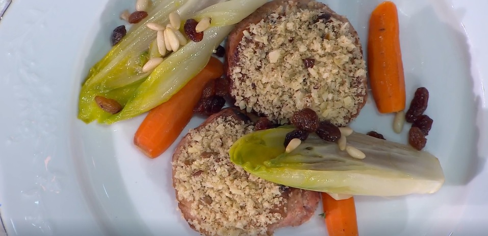 Leghiamo i due medaglioni di maiale con lo spago, sui bordi, li infariniamo e li mettiamo a sigillare su una padella ben calda con un filo d’olio, cipollotto, aglio e mazzetto di erbe aromatiche. Sfumiamo con il vino e, una volta ben rosolati, li trasferiamo su una teglia e li spennelliamo con l’albume d’uovo sbattuto, quindi li copriamo con la panure alle olive e li mettiamo in forno caldo e statico a 200° per 6 minuti.
