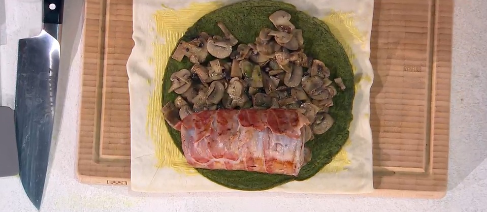 Stendiamo il rettangolo di pasta sfoglia e spennelliamo la superficie con la senape. Adagiamo sopra la frittatina di spinaci fredda, proseguiamo con i funghi spadellati e freddi ed adagiamo sopra il filetto ormai freddo (foto). Arrotoliamo il tutto sul filetto, rifilando gli eccessi di pasta sfoglia.