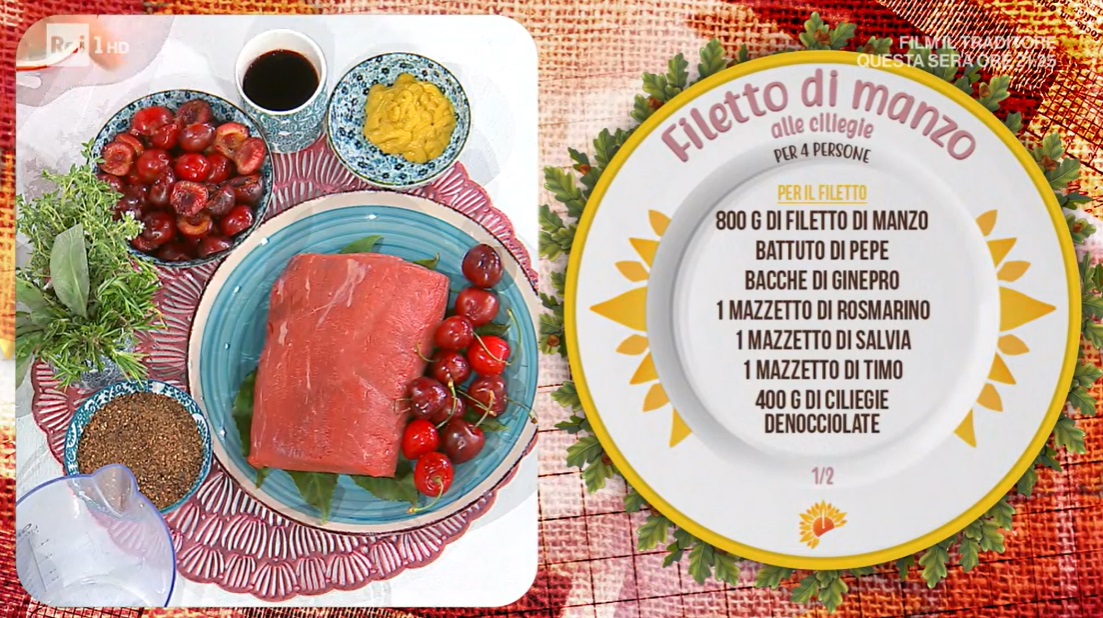 - 800 g filetto di manzo, battuto di pepe bacche di ginepro, 1 mazzetto di rosmarino, salvia, timo, 400 g ciliegie denocciolate, 1 bicchiere di liquore alla ciliegia, 250 ml fondo bruno, 1 cucchiaio di senape, olio evo, sale
