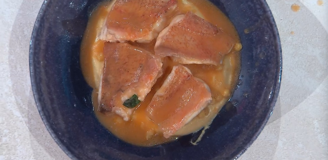 Prendiamo i filetti di scorfano e li scottiamo in padella con un filo d’olio: basteranno pochi istanti per lato. Aggiungiamo il brodetto in padella e lasciamo cuocere circa 10 minuti, rigirandolo.
