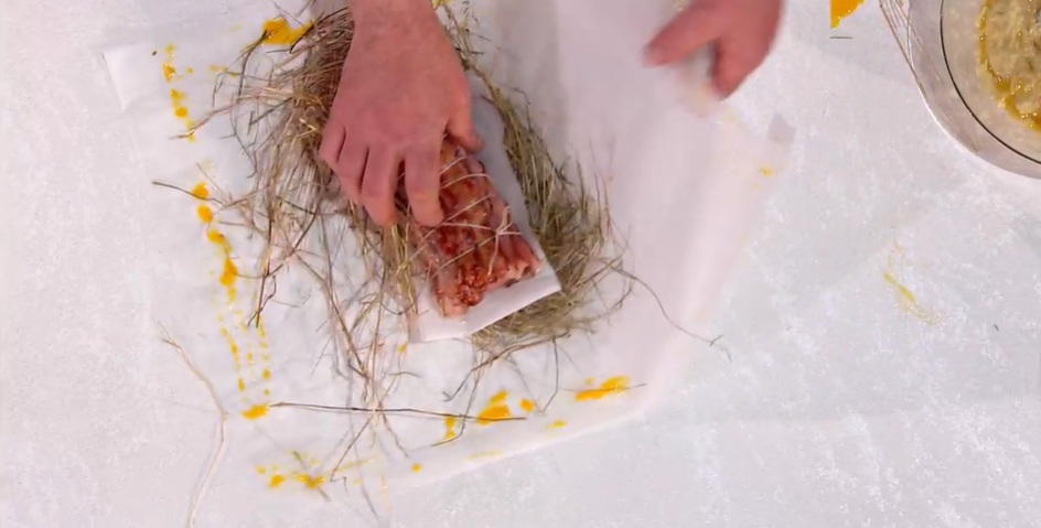 Scaldiamo una padella con un filo d’olio e mettiamo a sigillare il nostro arrosto su tutti i lati. Su un foglio di carta forno, intanto, creiamo un ‘nido’ di fieno o erba aromatiche, sopra ancora un pezzo di carta forno e, sopra questo, l’arrosto rosolato. Spennelliamo i bordi di carta forno con il tuorlo, quindi la ripieghiamo sulla carne, sigillando i bordi e creando un cartoccio. Mettiamo a cuocere in forno caldo a 210° per 25 minuti.