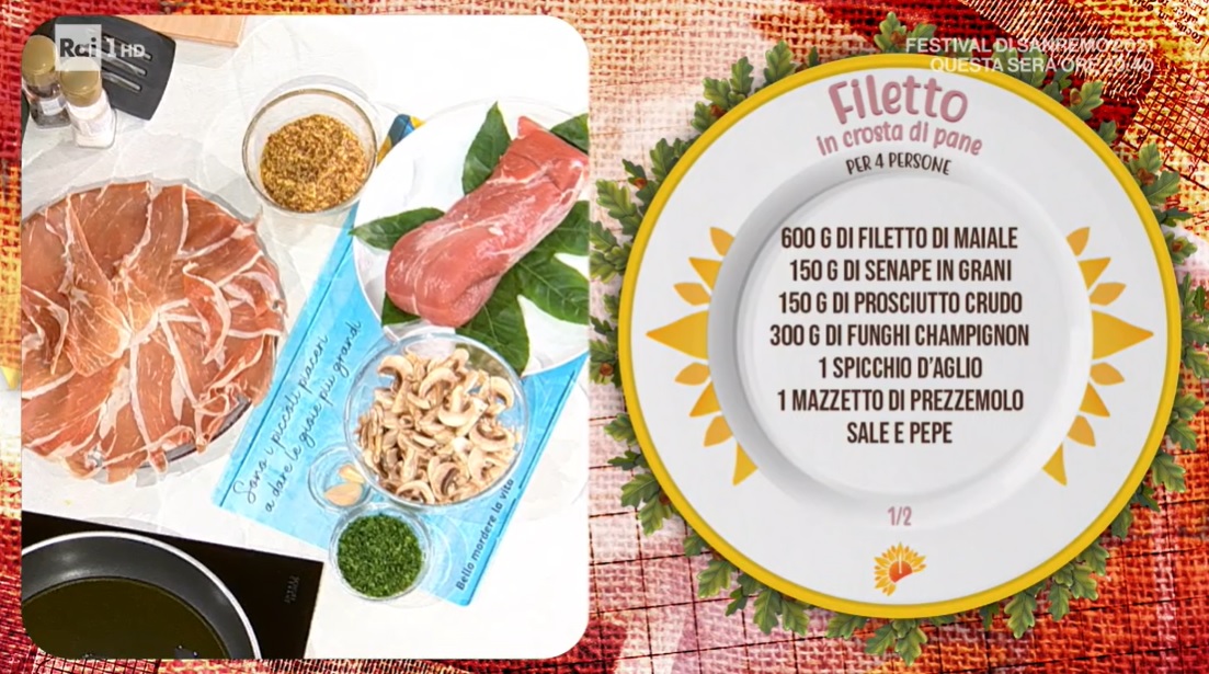 - 600 g filetto di maiale, 150 g senape in grani, 150 g prosciutto crudo, 300 g funghi champignon, 1 spicchio d’aglio, 1 mazzetto di prezzemolo, sale e pepe