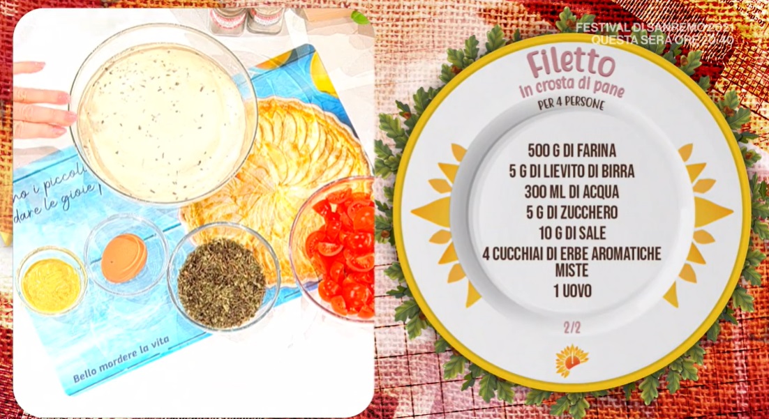 - 500 g farina, 5 g lievito di birra, 300 ml acqua, 5 g zucchero, 10 g sale, 4 cucchiai di erbe aromatiche, 1 uovo