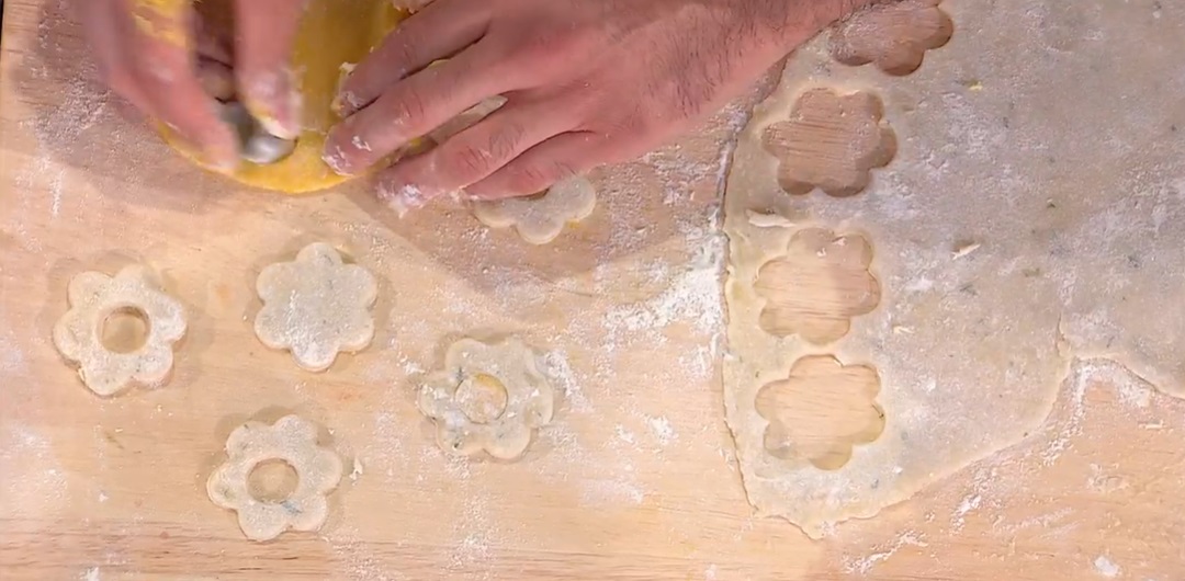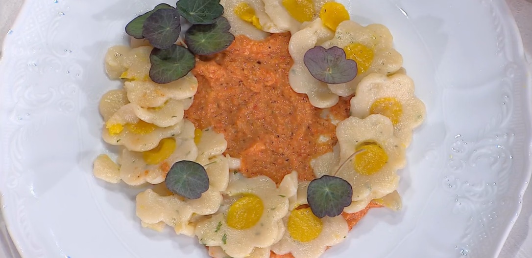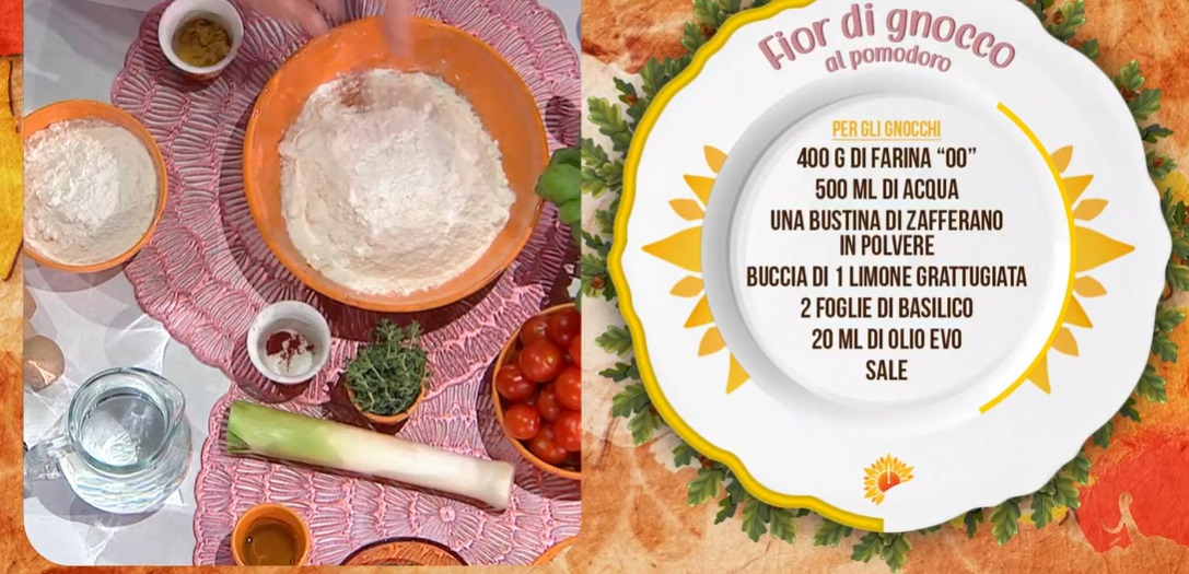 Per gli gnocchi, portiamo a bollore l’acqua con olio e sale. Quando l’acqua bolle, aggiungiamo la farina tutta d’un colpo e mescoliamo energicamente, sul fuoco, fino a formare una palla che si stacca dalla pentola. Trasferiamo sul piano da lavoro e lavoriamo qualche istante con le mani, da caldo. Dividiamo in due panetti e, ad uno aggiungiamo lo zafferano in polvere, all’altro il basilico tritato e la scorza grattugiata del limone. Lavoriamo fino ad ottenere due panetti omogenei. Con un mattarello, stendiamo i due panetti ad uno spessore di 2-3 mm, quando sono ancora caldi. Con dei tagliabiscotto, ritagliamo dei fiori dalla sfoglia al basilico. Rimuoviamo un tondino al centro del fiore, che sostituiamo con un tondino di impasto allo zafferano e viceversa. Lessiamo in acqua bollente e salata. Quando sono cotti, li scoliamo e li condiamo con un filo d’olio.