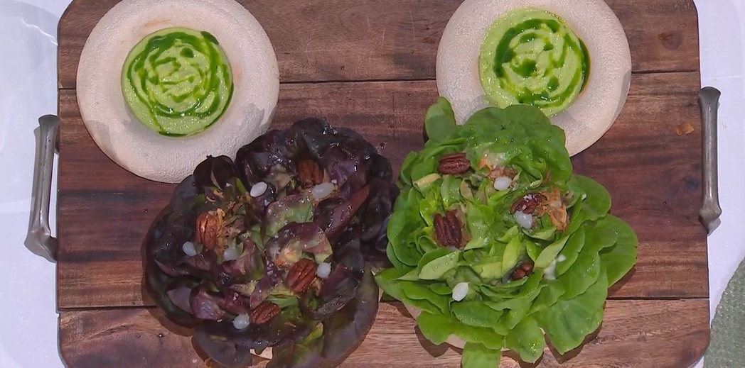 Prendiamo i cespi di lattuga, verde e rossa, e dopo averli lavati e asciugati, li condiamo con olio, aceto e sale. Farciamo gli spazi tra le foglie con la salsa alabama, quella alle arachidi, cipolla fritta, le cipolline in agrodolce, le noci. A parte, serviamo il gazpacho.
